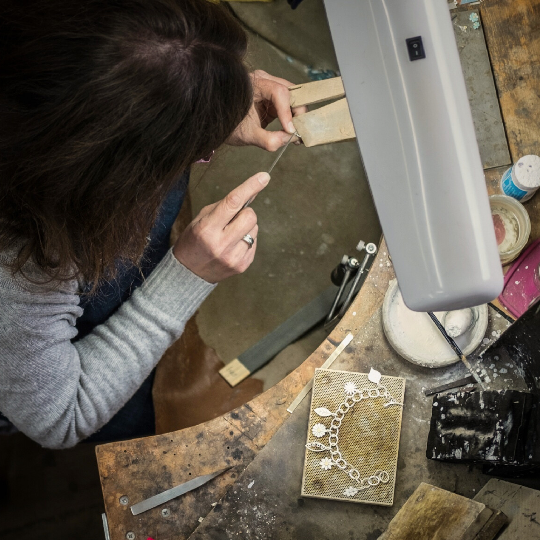 Every piece of ice skating jewellery is meticulously handcrafted by an experienced jeweller using traditional techniques. This intricate process involves saw-piercing silver, creating jump rings by hand, expertly filing, sanding, polishing and soldering the metal.